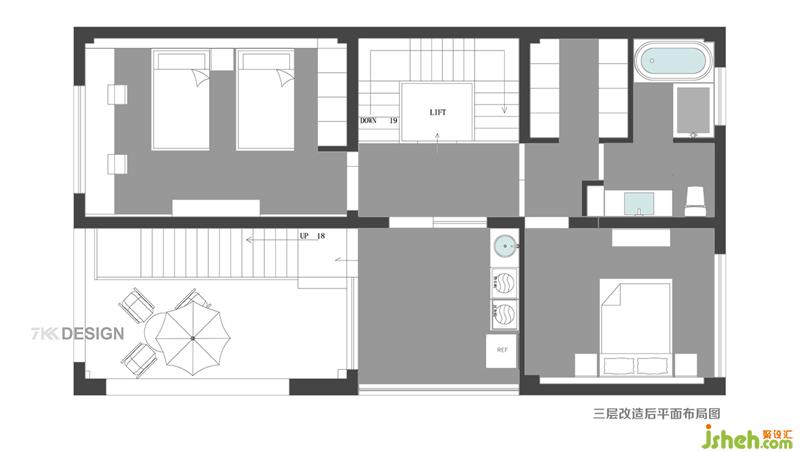三楼改造后平面户型图 三层使用面积有90㎡ 1、楼梯上来南边的一个卧室是儿童房,作为两个男孩的休息空间,北边卧室作为主卧是业主夫妻房。 原本儿童房作为主卧使用,后来改变功能一是因为两个男孩如果在北边的卧室会觉得比较拥簇,其次他们找过风水大师测算,北边的卧室作为主卧使用会带来好运。 2、主卧外侧是衣帽间和卫生间空间。开放式步入式衣帽间,卫生间干湿分离,马桶和台盆中间采用玻璃隔断,淋浴区单独空间靠窗设计拥有更好的通风效果。 3、重建的区域作为洗衣房,顶部部分玻璃搭建,采光通风视觉效果都很好。剩下是部分露天阳台,准备后期做别的功能使用,暂时也是晾晒空间。