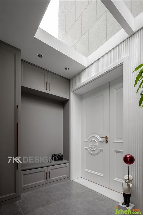 入户门外边的小庭院虽然面积不大,但是效果很赞,顶部采用透明玻璃顶,采光充足。靠墙转角做到顶的高柜+换鞋凳一体设计,进门可以放置临时进出的物品,坐着换鞋很方面。柜体选择高级灰,进户门选择白色欧式造型门,高贵庄严大气又含蓄雅致。最吸引眼球的是角落的装饰品,小孩拿着红色的气球,似乎在迎接主人到来,很有乐趣。让庄重内敛的庭院瞬间变得活力有趣味。