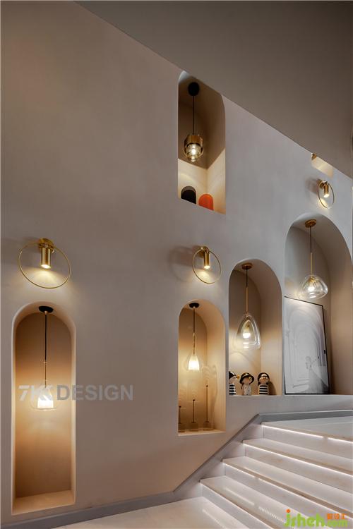 拱形造型沿着台阶高度设计,里面搭配精致吊灯,上面摆放可爱的装饰品艺术挂画,充满文艺感,又有一丝童趣活力在里面。如果弧形的玻璃预留一扇门,这里也将成为小孩子玩耍的快乐天堂哦。#楼梯 #摆件 #装饰画 #吊灯 #壁灯