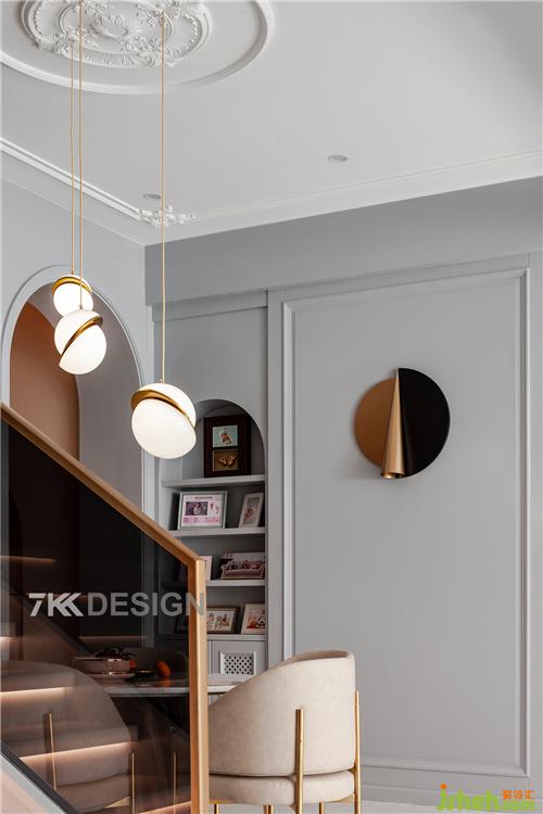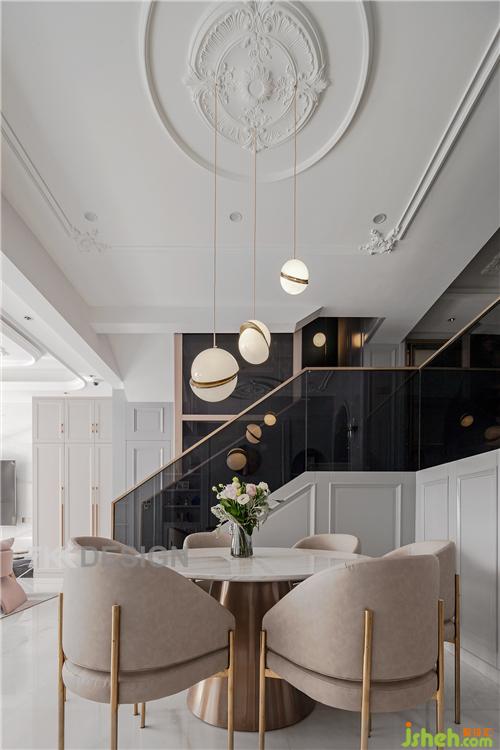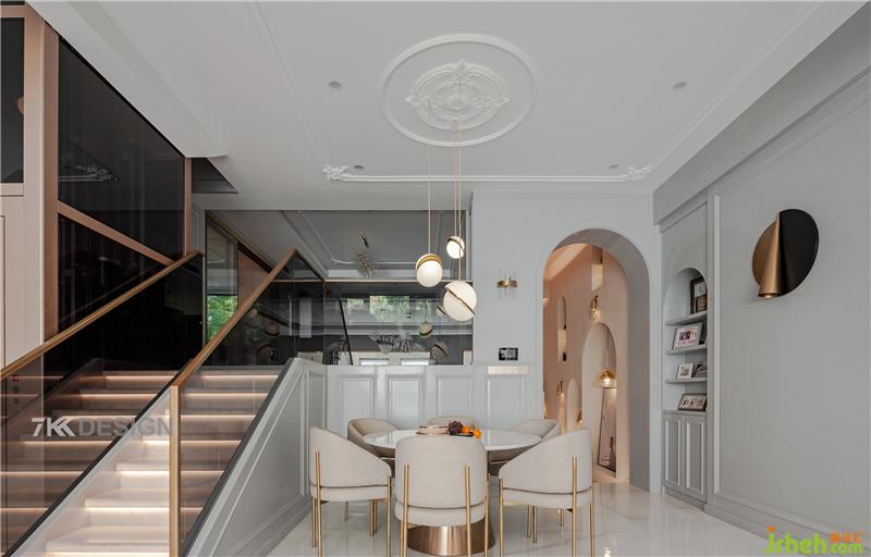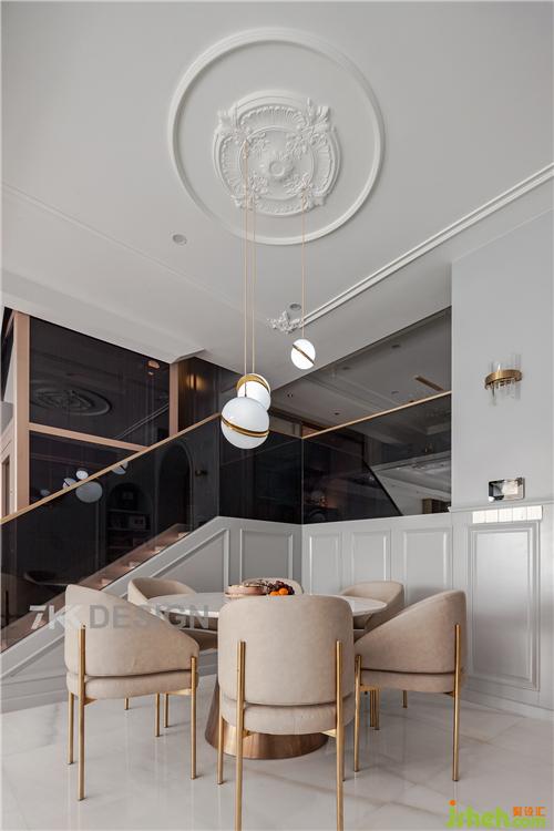 改变原始楼梯腾出中餐厅的位置,吊顶顶部圆形的造型设计与圆形桌子的搭配相呼应。从楼下的空间透过玻璃可以看到楼上的动态。楼梯扶手也是选择玻璃材质, 显的空间轻盈通透。玻璃的隔断使得楼上楼下隔而不断,形成很好的互动性。