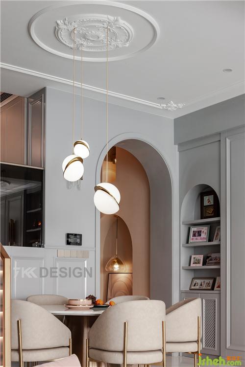 餐厅吊灯选择错落简约的白色半圆球装饰,为餐厅增添艺术情调氛围,可以随意灯光调节色温,营造不同的餐厅环境。