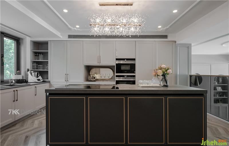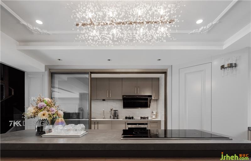 西厨加岛台功能区域,宽敞大气。原始中厨缩小了空间,设计西厨增加更多的操作功能和储藏空间。中部岛台加吧台的设计,提升空间格调,岛台下面还有收纳空间,非常实用。上方的艺术吊灯装饰为空间增加艺术氛围。正面一侧定制到顶的高柜,里面容纳设备柜(双开门冰箱+烤箱+微波炉)和更多的储物功能。