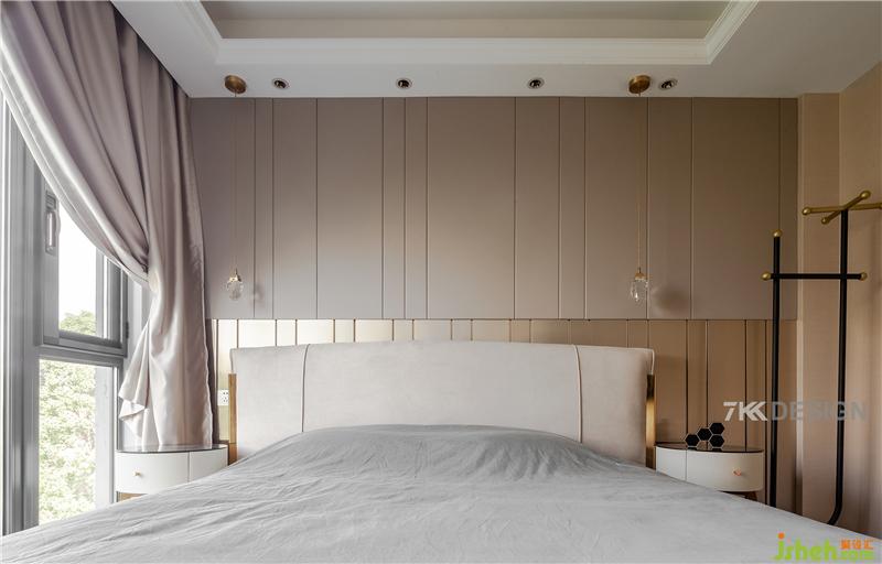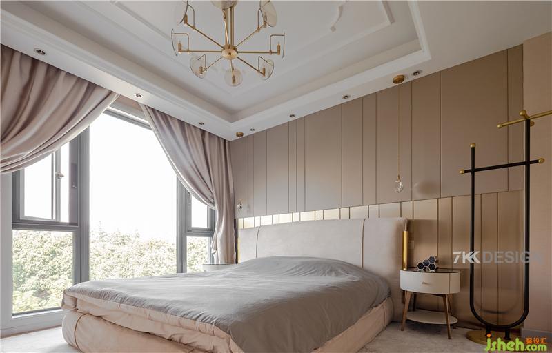 这是三楼的主卧,业主夫妻的房间,窗户朝北,原本是选择朝南的方向,因为风水大师的缘故选择了这间朝北的卧室。主卧整体选择大地色系中较淡的颜色为主,赋予卧室静谧又灵动的气质,仿佛流淌的诗句般优雅。