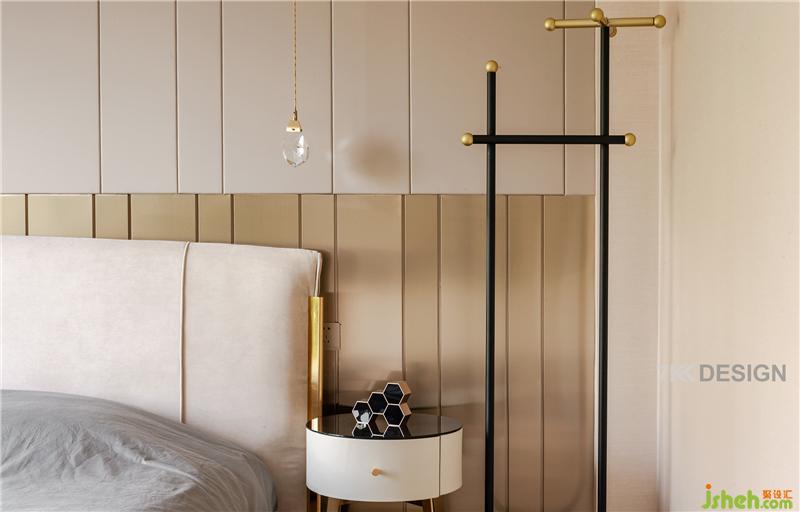 床头吊柜下面结合竖型的造型拼接,增加线条层次感。圆形简约床头柜摆放几何形拼接的装饰品,充满艺术感。旁边黑色简约的线条衣架,为卧室摆放衣物增加便利性。