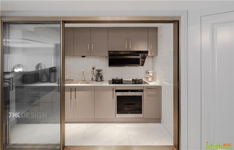 厨房一字型设计,白色地砖拼接,玻璃移门金属边框,营造简洁大气时尚的烹饪环境。