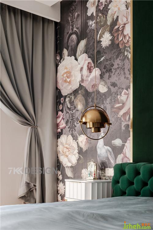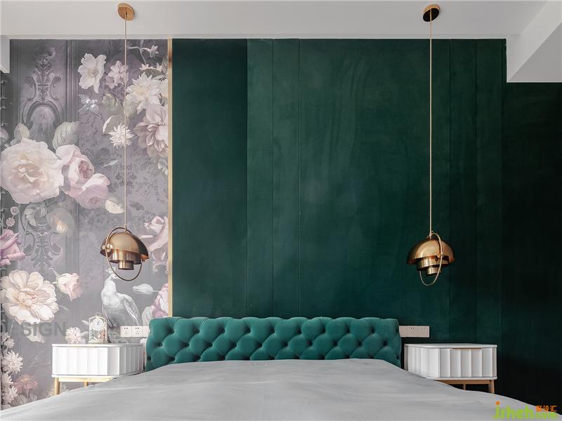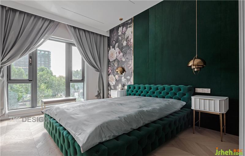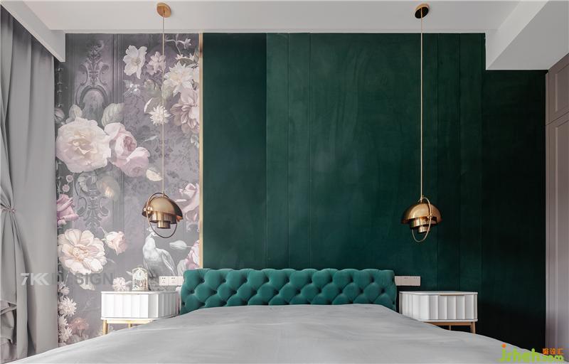 为方便父母的使用,把二楼朝南的一间卧室作为父母房,可以看出业主对父母深切的爱。父母房床头背景墙采用大面积墨绿色与花型图案拼接,床也选择墨绿色软包样式,短毛绒布,手感柔和,轻奢典雅。细看吊顶内嵌灯带,打开灯有种科技感相融合。