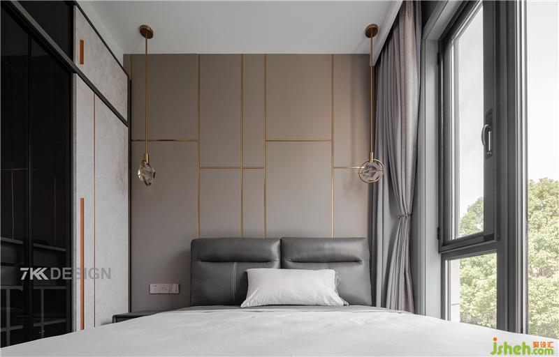 二楼客卧空间是后来重新搭建的空间,纳入室内使用。即使客卧也设计的精致舒适,床头背景墙采用软包材质金属条纹镶嵌,两边搭配精致吊灯,灰色床头软包,双层窗帘搭配营造质感舒适的睡眠环境。
