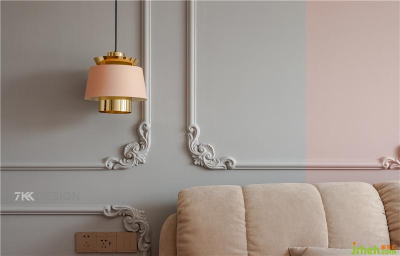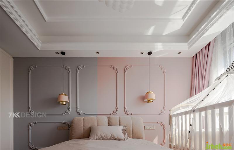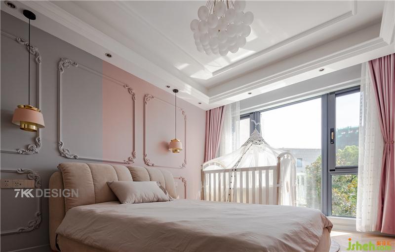 二楼朝南的女儿房法式风情,浪漫梦幻。床头背景墙粉色与浅灰色拼接,墙面上用石膏线勾勒出经典的线条,尽显法式优雅。天花板搭配白色球状吊灯造型优美,粉色窗帘与粉色背景墙相呼应,明亮宽敞的空间,整体充满连贯性。