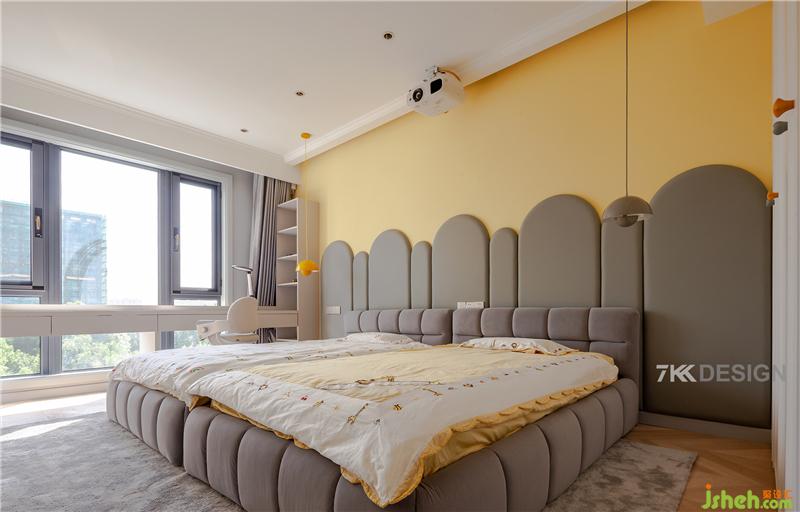 三楼男孩的房间,两个双人床拼接一起,促进兄弟的感情,亲密无间。更方便互动玩耍,释放孩子的天性。床头背景选择明快的黄色与拱形几何体软包拼接,打造童趣世界。