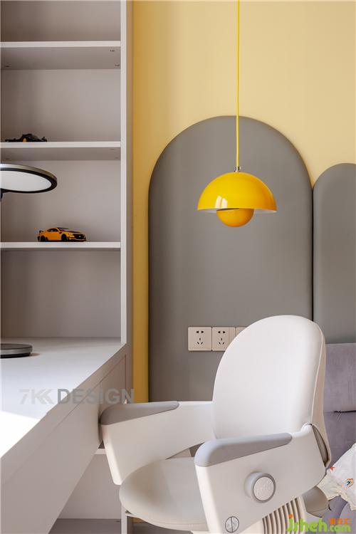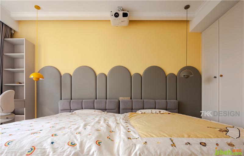 背景墙上方是投影仪,正面有投影幕布,为孩子们开启属于他们的童话世界,乐享影视带来的欢趣。左右饱和度较高的黄色和灰色的吊灯搭配简约个性。