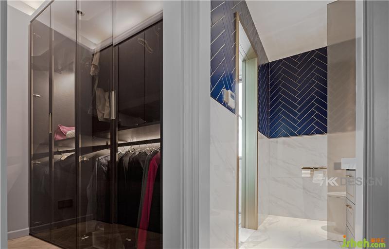 卫生间干区另一侧是步入式衣帽间,靠窗空间是淋浴区。步入式衣帽间选择玻璃样式,内藏灯带,打造高级感的衣帽间。