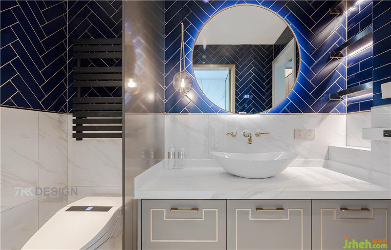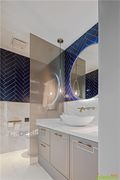 三楼卫生间,主要为夫妻和两个男孩使用。卫生间干湿分离设计,台盆区与马桶间采用玻璃隔断。台盆柜上方选择高颜值的台上盆,曲线造型优雅大气。墙面下面一半是白色墙砖,上面一半选择海洋蓝几何型瓷砖拼接,打造清爽时尚的洗漱空间,金属元素的点缀出轻奢精致的品质生活。