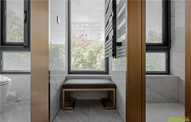 淋浴区与马桶间都靠窗设计,中间摆放一张换衣登为父母和小孩洗澡提供方便。从细节可以看出这对夫妻对父母的关心之处,很有孝心。窗户都选择内嵌百叶窗,透而不空的视觉感,既可以保持居家环境的隐私性,又可以保持明亮大方的采光。