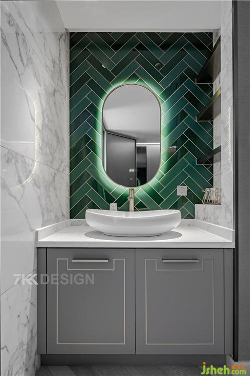 二楼卫生间主要为父母,女儿和客人使用,干区台盆柜上方同样选择高颜值的台上盆,正对的墙面选择深浅不一的墨绿色瓷砖拼接,椭圆形智能镜子搭配,台盆右侧的墙面凹进去做壁龛使用,上面定制层架摆放洗漱用品。