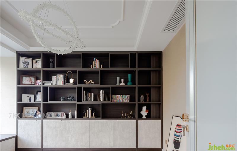 儿童的多功能书房,靠墙定制一整排到顶的书柜+装饰柜形式,美观实用。中间是预留书桌的空间,拍摄时业主还没有买回来。