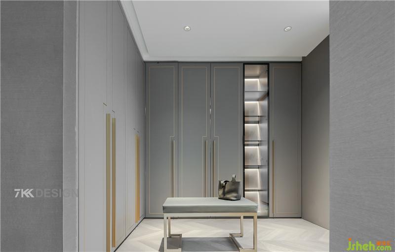 二楼的转角L衣帽间,为父母和女儿房提供更多的收纳空间。定制到顶的衣柜,高级灰色柜门,金属线条门把手装饰,精致大气。一排衣柜设计玻璃柜门内藏灯带,增加光线,使得整体空间不在单调,增加空间轻盈感与通透感上海别墅装饰。