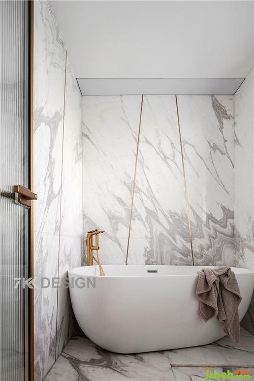 淋浴区结合浴缸,墙面与地面采用相同石材拼接,自然流畅的石材纹理与金属线条镶嵌,让你在淋浴泡澡时享受天然纹理之美,简约而奢华。