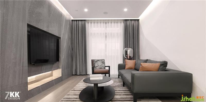 电视背景墙采用深色石材墙面,内嵌灯带,沙发背景墙采用特色造型刷白色艺术漆,石膏板吊顶内嵌灯带设计,即使是不同材质不同造型在同一空间上却处理的错落有致,精致而又大气。