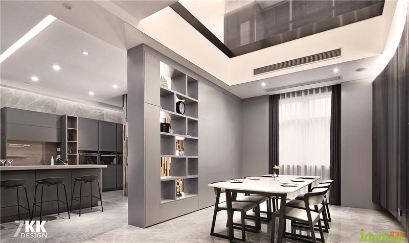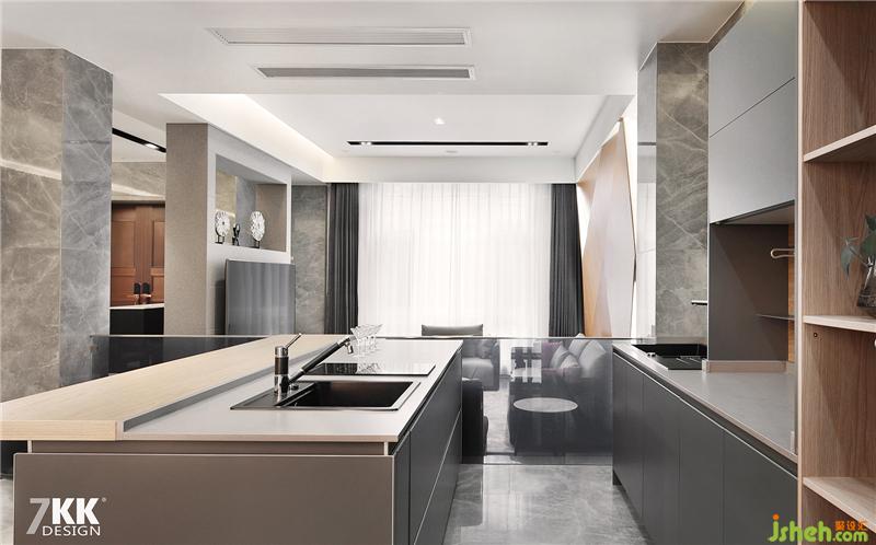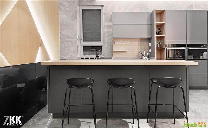开放式厨房集休闲与实用一体,岛台台面采用石英石搭配灰色烤漆门板,中西厨分离的形式,新颖时尚。也是高品质家居的一种体现。