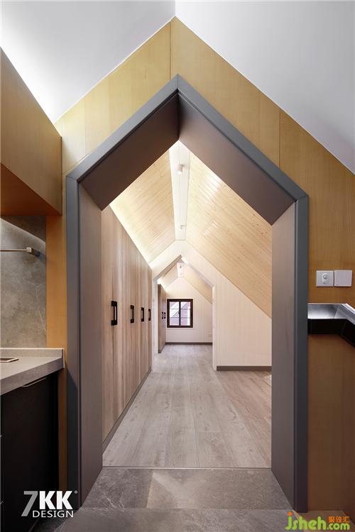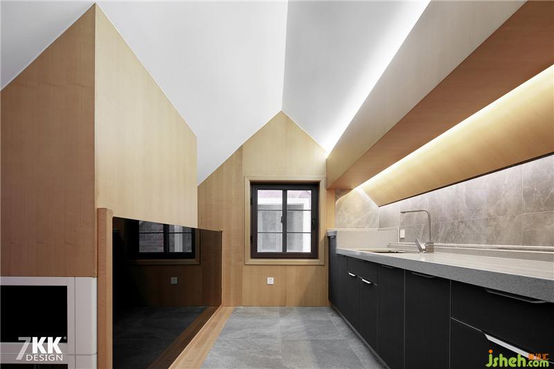 这是利用顶层斜顶的巧妙利用,刚好搭配整体异型造型的主题,在灯光合理运用的衬托下,深与浅,暖与冷,打造独特艺术氛围的厨房空间。是不是很别致啊。