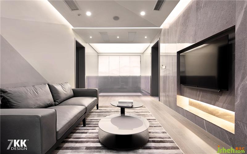 二楼的起居室,干净简洁。仔细看沙发背景和顶面都是异型造型,遥相呼应,本案的不规则主题各处显现。在客厅靠近阳台的空间做了挑空处理,另一边是父母的生活阳台。