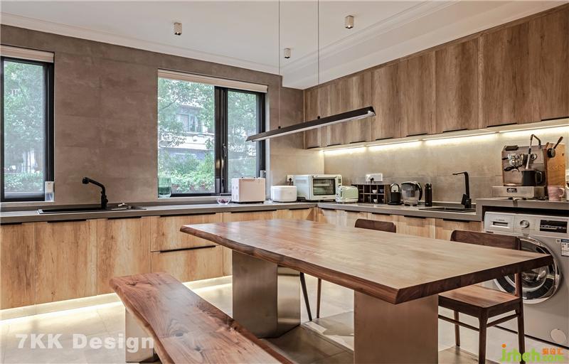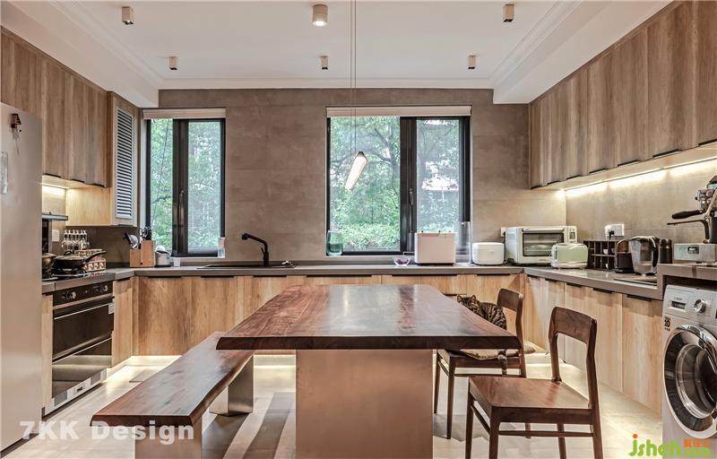 2、业主希望有个大的厨房空间,敲掉原有厨房和餐厅公共墙体,打造开放式厨房,沿着窗户做了超大U型厨房操作台面,中间放置餐桌,开放式的形式让整体空间更宽敞,收纳也更强大。利用角落台面空间下侧放置洗衣机。使用起来也比较方便。