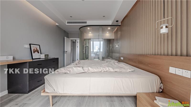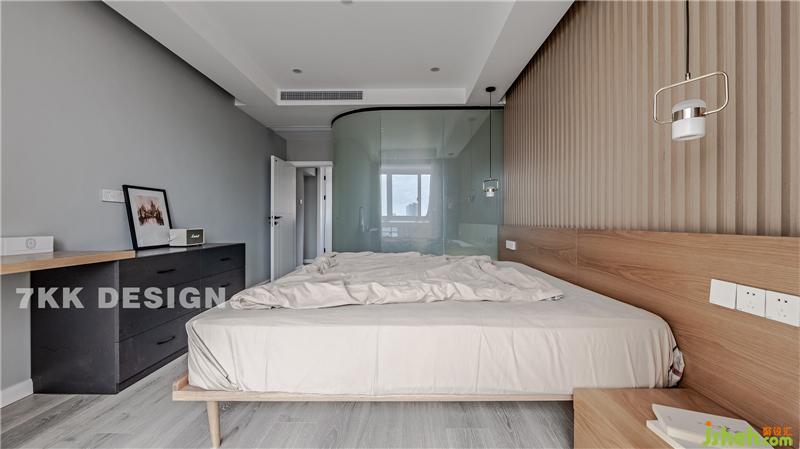 主卧衣帽间利用了走廊空间,腾出更多的空间留给主卫,采用雾化玻璃作为隔断,将卧室打造成独立的空间。弧形玻璃设计,让空间更具柔和感。这种玻璃通上电就能做到和磨砂玻璃一样的效果,保证休息空间里的私密性。断电就会变成普通的玻璃,保证足够的采光以及通透性。