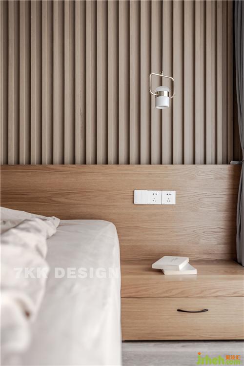 床头背景墙采用实木线条、木纹饰面板搭配落地式木纹饰面板抽屉,自然清新、大方美观。床头柜上方简约吊灯垂下,营造温馨的阅读一角。