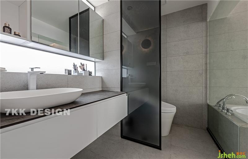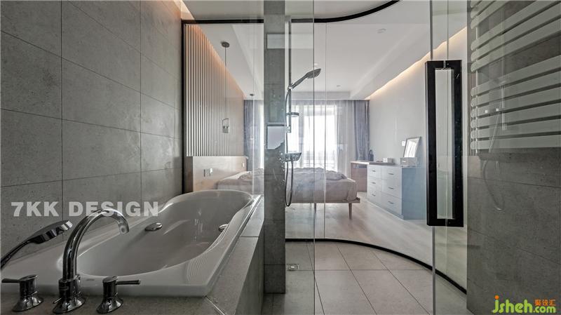 卫生间三分离,干区,马桶间、淋浴间彼此用玻璃做隔断,干净清爽,互不打扰。淋浴间巧妙的运用雾化玻璃与卧室休息空间随时保持通透与私密性。超大浴缸搭配,下班回家泡个澡,放下疲倦,享受安宁很是惬意。