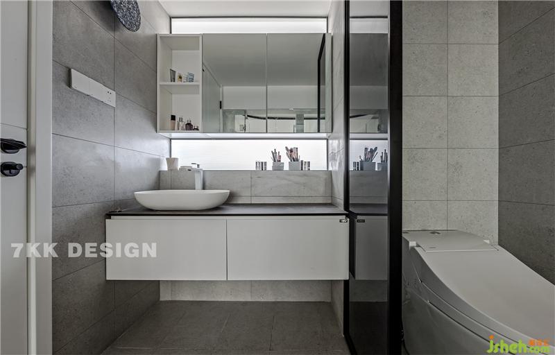 卫生间干区与马桶间玻璃隔断,干区简约吊柜,方便打理,选用台上盆,简单大气。上方镜柜开放式与封闭式结合,满足女主人化妆收纳的功能。镜柜上下方嵌入式灯带,营造更好的化妆环境。