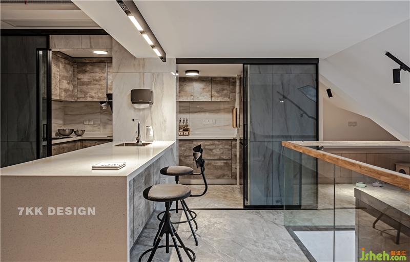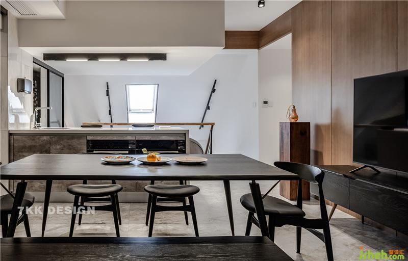 阁楼从楼梯上来为西厨吧台+餐客厅结合开放式空间。这里空间是阁楼最高的空间3.1m高,苏州装修设计人站立处于比较舒适的位置。 餐桌椅选择经典黑色,质感充满时尚感。精致的餐具及装饰品的点缀给空间带来活力。