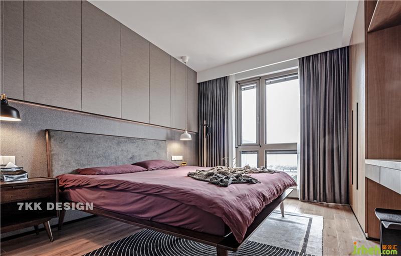 主卧是业主夫妻居住。他们衣物比较多,比较注重收纳功能。电视背景墙和衣柜结合整体定制,苏州装修设计让收纳更整洁。灰色+木色为基调,脏粉色床品让室内变得温柔浪漫,经典灰白地毯搭配,豪华又舒适。