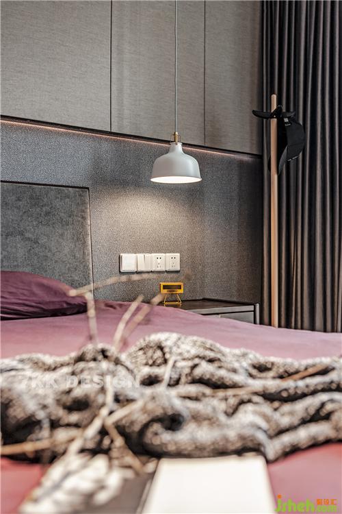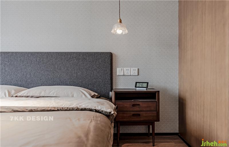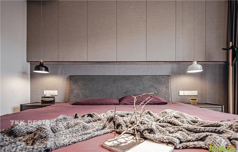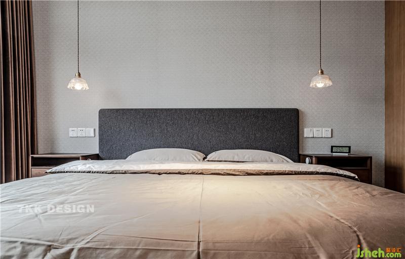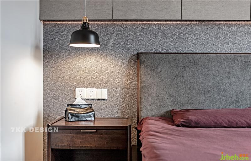 为拥有更多的储物功能,业主要求床头增加一排吊柜,隐藏式门板让空间更完整简洁。床头背景墙采用富有肌理的壁纸铺贴,左右黑白搭配的吊灯为空间带来不一样的时尚感。