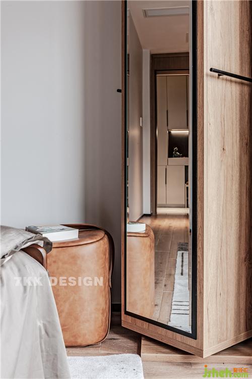 床头背景墙面选择浅灰色质感壁纸,富有肌理感。床头柜一侧墙面木饰面装饰简约而不简单,和另一侧衣柜柜体材质颜色协调一致。