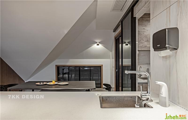 白色西厨吧台和黑色餐桌和谐搭配,最里面的顶部斜坡造型让整体空间更加丰富立体。
