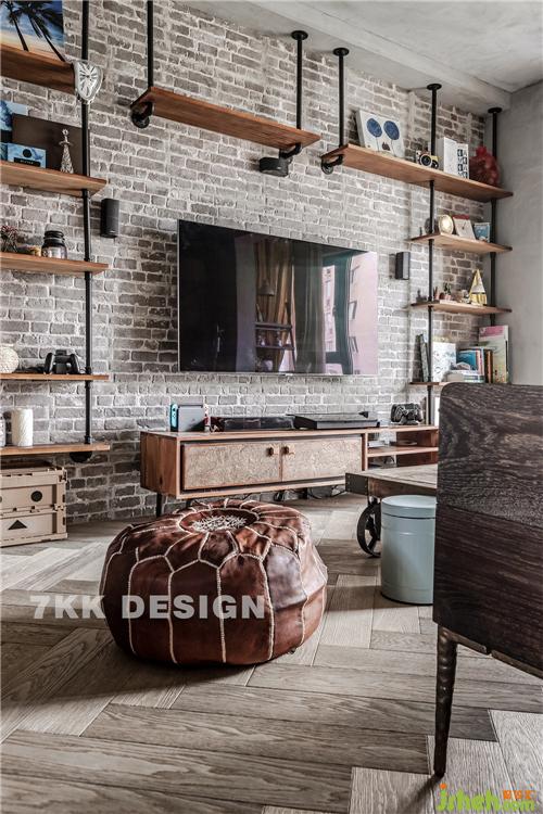 客厅的顶部和部分墙面采用素水泥漆,地面实木复合地板,电视机背景墙方形文化砖拼接,整个空间刻意打造成粗犷的感觉。上海装修设计客厅的上方安装着滑轨铁艺照射灯,阳台打造慵懒随性的休闲空间,更多的时候是家里2条斗牛犬霸占这空间。