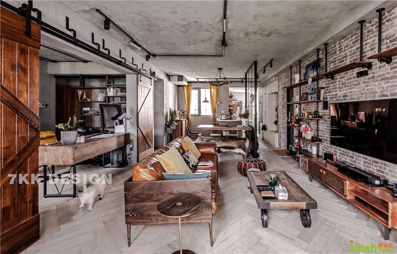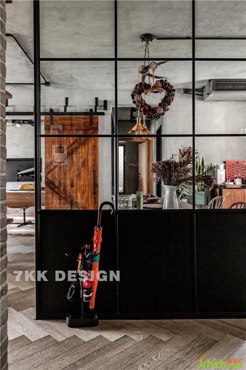 4、和客厅相连的卧室的墙体被敲掉了,做成书房,用谷仓门做隔断,和客厅空间形成可封闭可开放性的互动形式。和过道一侧的非承重墙也敲掉,用铁艺和板式结合的开放架来做过道的隔断,正好能放男主人的手工艺术品。同时弥补过道采光的不足。