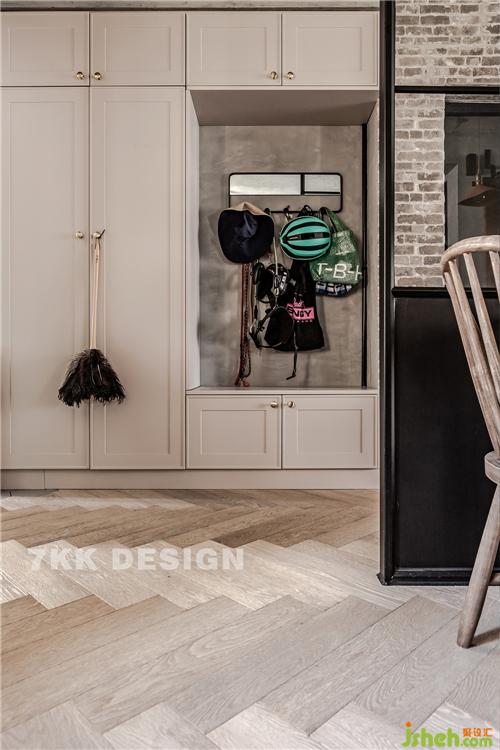 1、进门右边定制整体鞋柜一直延伸到厨房空间,平时穿的鞋子衣物、包包,包括平时遛狗用的绳索等工具随时放置也比较方便。