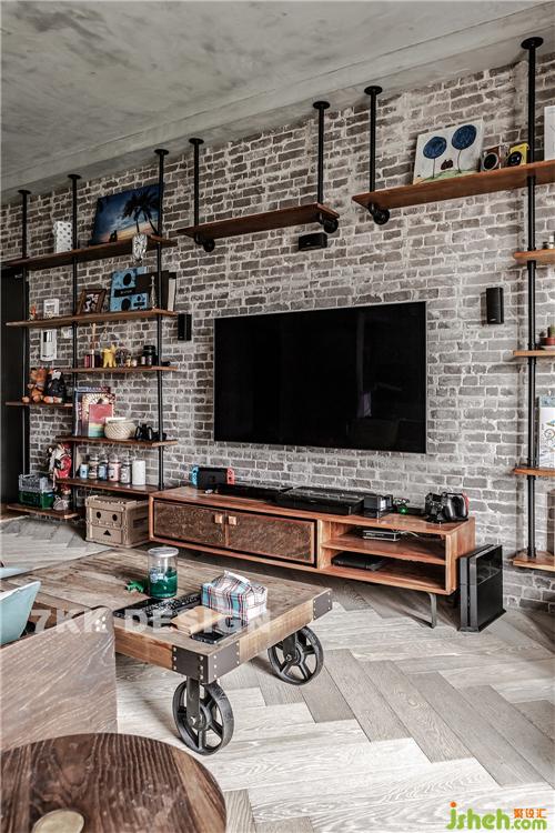整个电视背景墙利用铁艺和板式结合的开放架作为装饰,上面摆满业主的手工艺品。看似很多的物品却很有规律的放置。