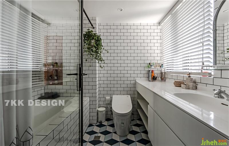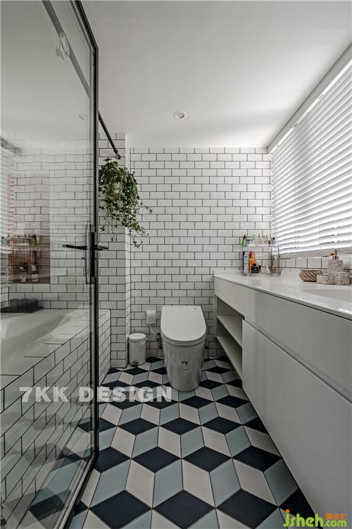 主卫地砖选用三色菱形铺地,墙面白色方形墙砖铺贴,吊挂的绿植点缀,打造干净清爽高颜值的卫生间。