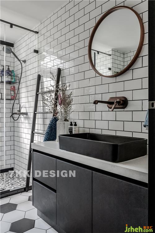 客卫的颜值一点也不输主卫,高级灰与白色搭配,铁艺架,干花,艺术圆镜,台上盆,每一处搭配都散发精致的艺术气息。