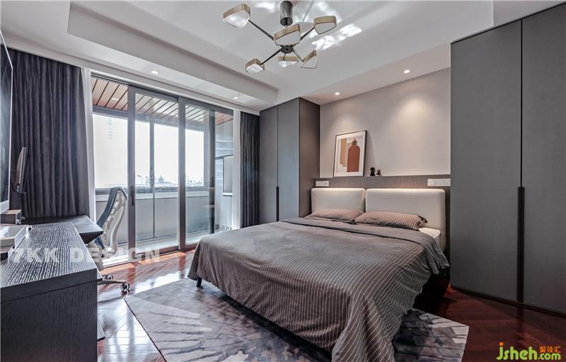 次卧拥有独立阳台,作为洗衣晾晒休闲的空间,床尾深色的办公桌椅和电视柜搭配,简单而质感。