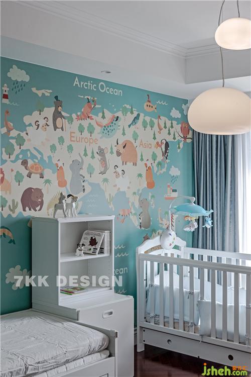儿童房墙面选用蓝色为基调很有童趣的壁纸作为装饰,白色成品床下方抽屉增加收纳搭配简单的床头柜也增加一些收纳需求,靠窗放置一张婴儿床,浅蓝色窗帘营造梦幻温馨的儿童房。