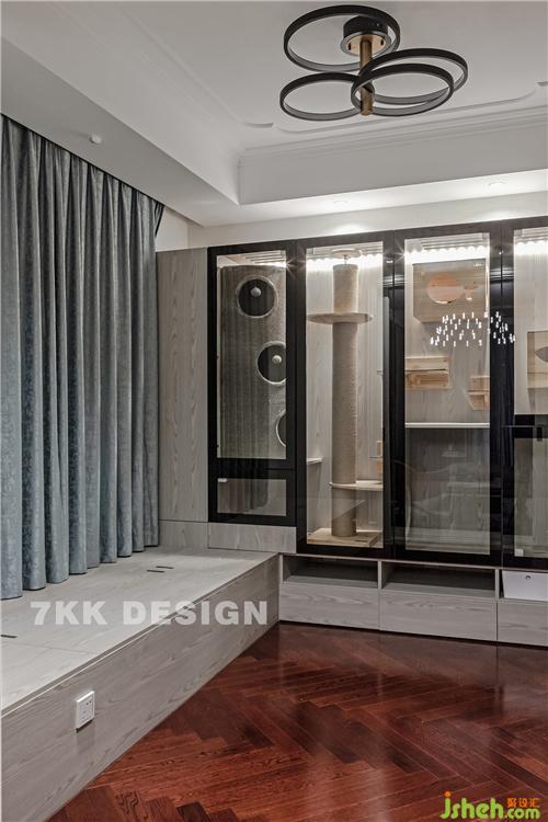 书房多功能房间设计,靠窗定制榻榻米,下面可以收纳,上面放上床垫,累的时候躺下也很舒适。靠墙一侧是定制的很有趣味的猫屋哦,木质与玻璃搭配,透过玻璃可以看到一个个可爱萌萌的猫爬架和小猫屋,下面开放格与抽屉结合增加收纳。