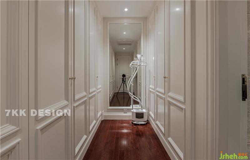 主卧衣帽间充满线条感,纯白色调,白色隐形柜门搭配金属门把手点缀,在走廊的尽头一面到顶的穿衣镜,最大面积地给予展示换衣效果,上海装修设计从头到脚都可以照得很清楚。主卫从左侧中间进入,卫生间门采用衣柜门一样的造型设计,让整个衣帽间看起来更完整大气,同时带来一丝神秘感。