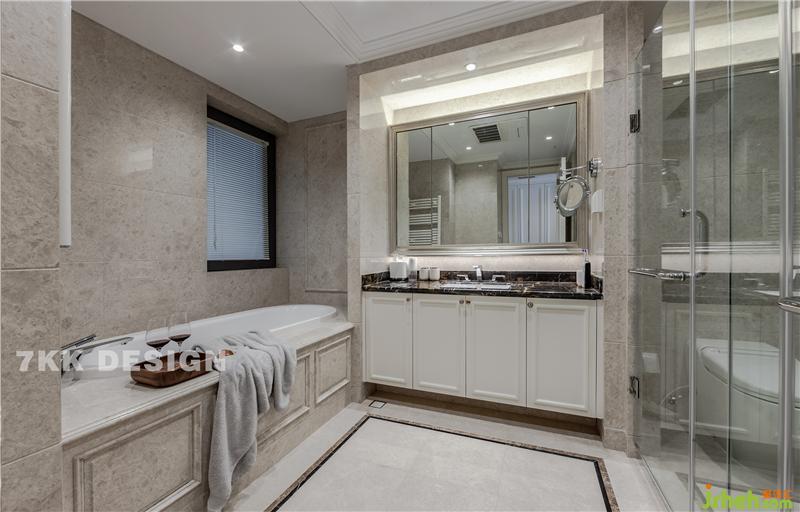 主卧卫生间以白色为基调,干净清爽明亮。豪华浴缸配备,也方便给宝宝洗漱。台盆柜悬空设计方便打理,马桶和淋浴一个空间,弧形透明玻璃门做隔断,使整个卫生间空间更加通透宽敞。