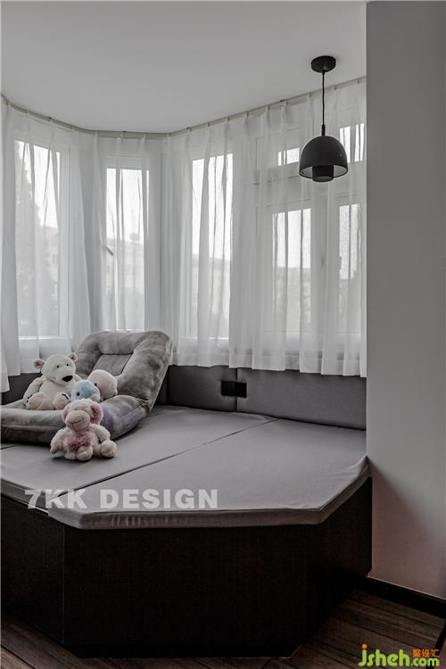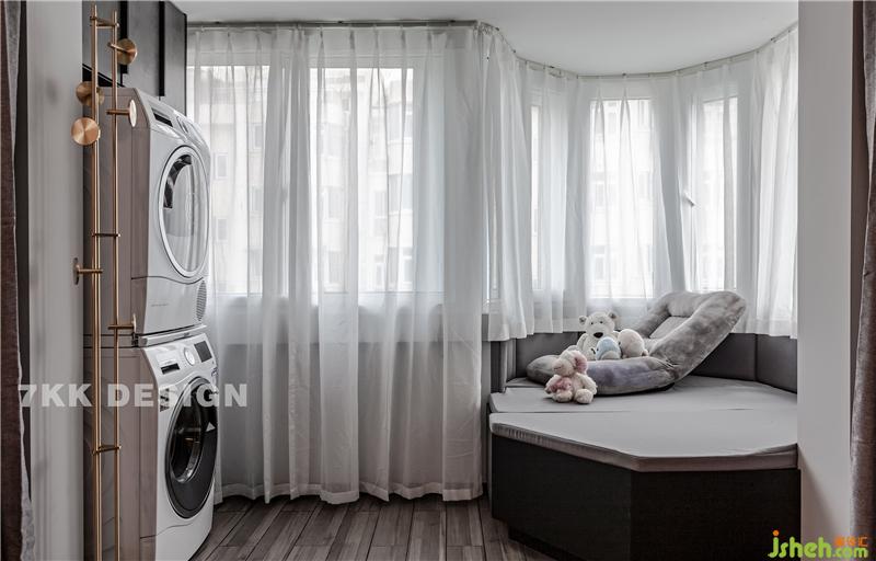 阳台一侧作为生活阳台放置洗衣机+烘干机,上面定制吊柜作为收纳,洗衣机里面一侧靠窗设计的水池,方便冲洗。地面选择地板砖和客厅地板颜色一致,视觉上扩大客厅空间,上海装修设计也方便打理。 阳台另一侧空间弧形一角充分利用,定制成不规则榻榻米,作为休闲一角,最外侧靠窗拉开白色飘逸的窗帘,坐着或者葛优躺在榻榻米上喝杯咖啡看看书,真的很惬意。