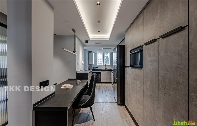 餐厅利用次卧部分面积,同时借助两边柱子定制餐桌,上方搭配一字型简约吊灯,很有格调。餐厅过道上方局部吊顶处理,嵌入式天花灯,增加空间层次感。过道靠墙定制一整排到顶的柜体,鞋柜+收纳柜+电器柜+拉伸酒柜。拥有很足的收纳空间。整体定制柜也让空间更整洁大气。