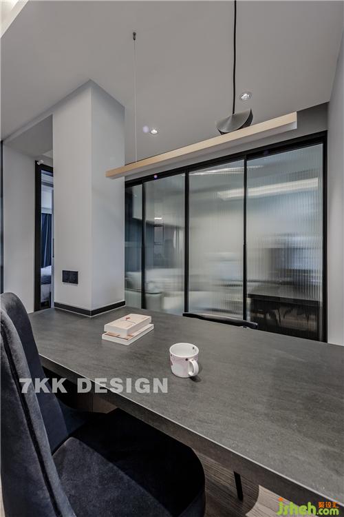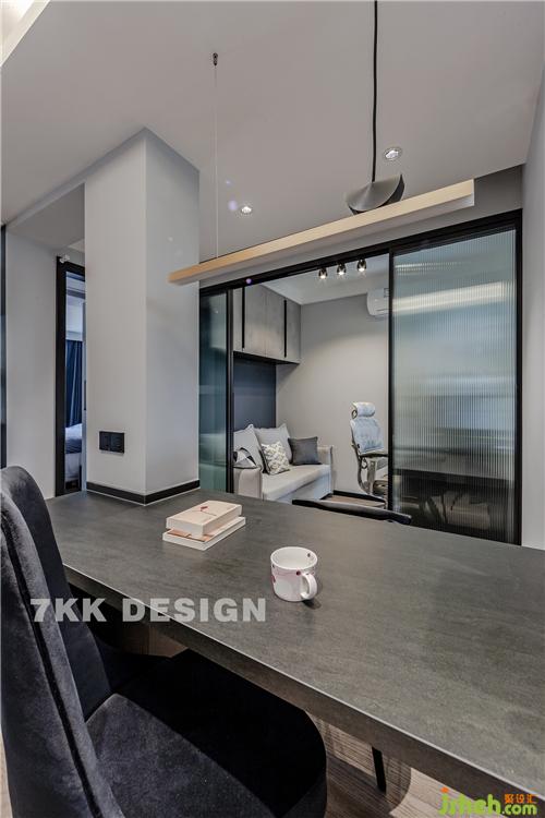 餐桌平时也可以作为办公看书的地方。从餐厅看书房,利用长虹玻璃移门代替常规门扩大视觉感,既不影响采光,空间可开放可独立。