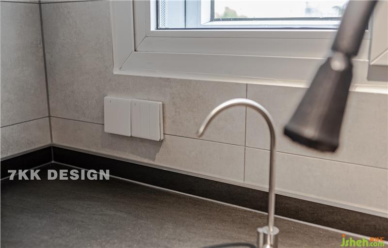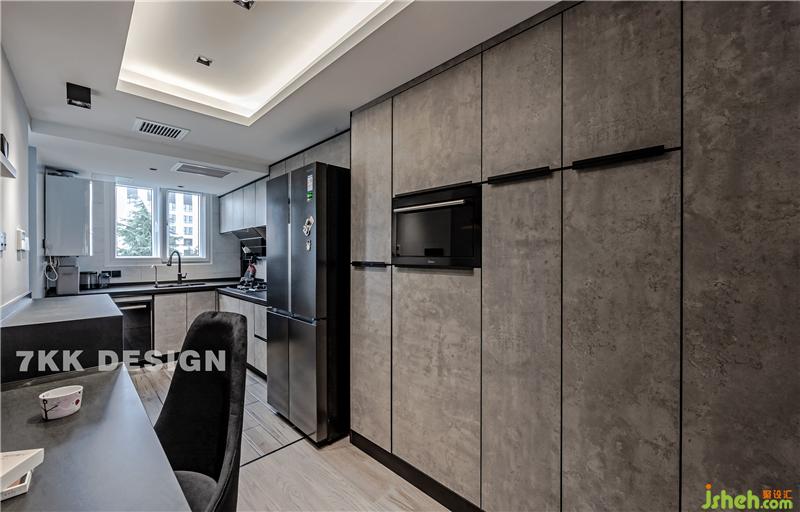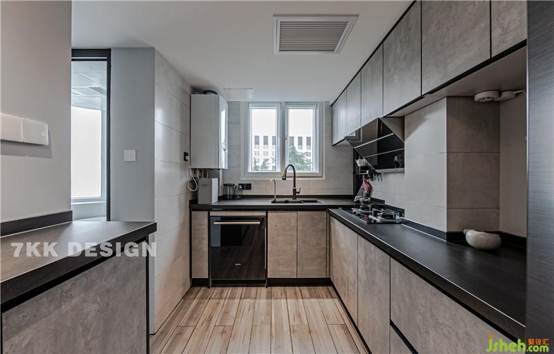 厨房开放式为主,改变卫生间的门的位置后,原始门的空间砌墙靠墙做成台面扩大厨房操作台面,上海装修设计靠窗设计L型操作台面,超大台面+合理动线设计充分满足烹饪最佳的洗切炒放的功能需求。上方定制的吊柜增加更多的厨房收纳功能。